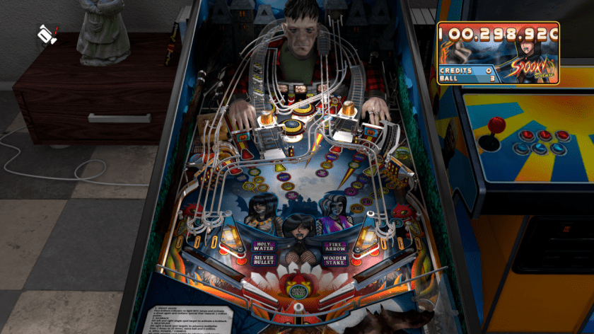 So, what’s the problem? Well, like other other Deluxe tables, the modes have too short a time limit and disable all other scoring. Forty seconds to shoot four orbits and then trap the ball in a semi-unreliable ball lock is kind of unreasonable. Thankfully, Spooky Deluxe has a pair mini-modes that end as soon as you complete the one and only stated goal (either shoot the BAT target three times or shoot the ball in either ball lock three times) for a cool five-million points. In my world record game on Xbox One (I am, as of this writing, the World Champion in Spooky Deluxe’s five-ball arcade physics mode), I completed exactly ZERO main modes and only one mini-mode. My record setting score was a result of building up the spinner value, along with a successful multiball. I’m also 2nd place in the same mode on Steam, and this time, I didn’t even score the five million point mini-modes even once. Which is not to say the modes are impossible. They just require you to be nearly perfect from the start of the mode, without the ball getting caught-up in a bounce cycle on the slingshot or the bumpers. A few modes I never even came close to finishing. Take for example “Silver Bullet”, which I’ll explain in the caption.